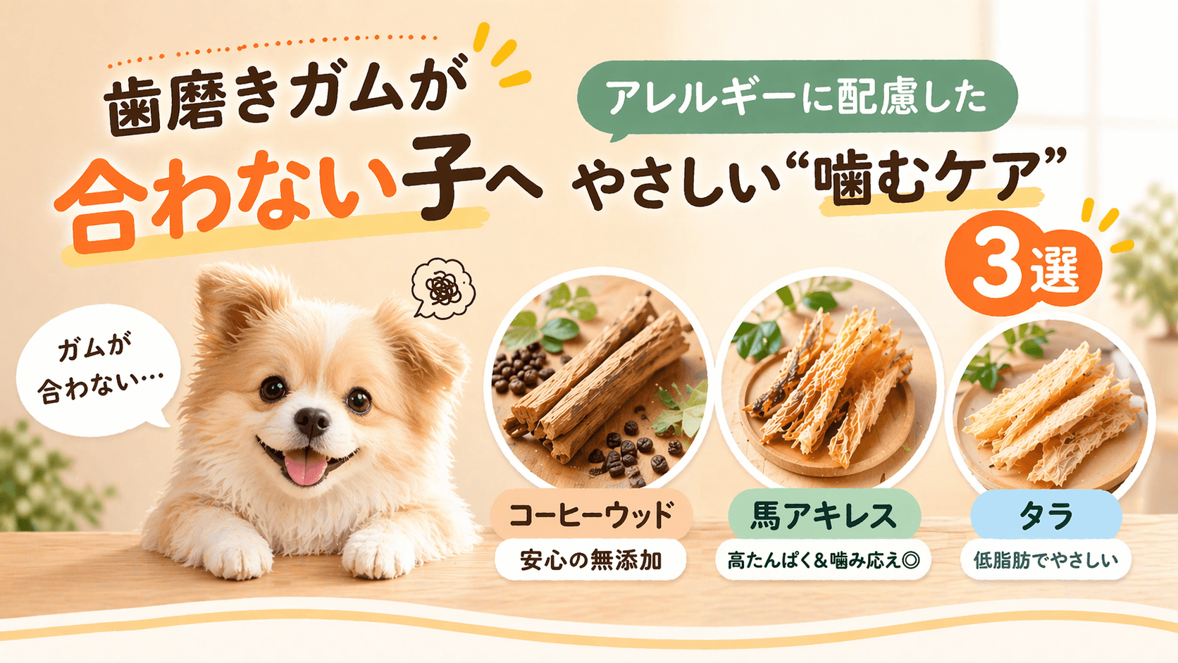 牛皮を使用していないガムや、VOHC(歯磨き効果が期待できるとされる)認定の歯磨きガムについては、別記事でもご紹介しています。よろしければあわせてご覧ください。→https://wansele.dog/dogcafe/goods/dental-2/